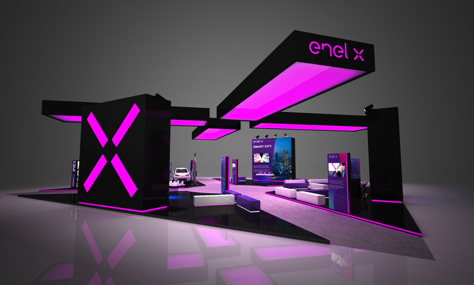 Housed inside the Fiera di Milano Rho, Enel X's space creates an overview of the different sectors of the Brand, ranging from electric mobility to energy saving solutions for homes and offices.